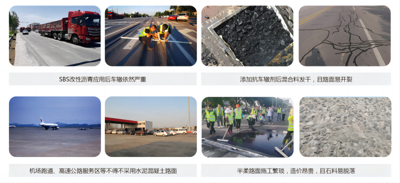 行业当前常用的SBS改性沥青、抗车辙剂等方案,其应用主要针对普通路段,尚无法满足重载苛刻工况路段对车辙寿命量化控制设计和设计寿命期不发生车辙病害维修的耐久性需求。有些路段因担心路面车辙病害的发生而不得不采用水泥混凝土路面或者半柔路面,但施工复杂,维修养护成本更高。
