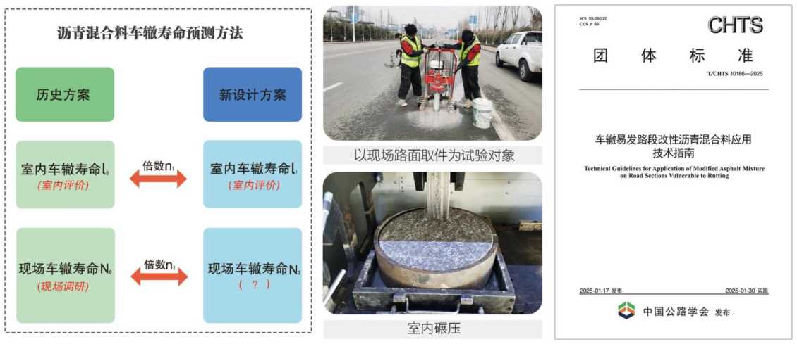 针对重载交通苛刻工况路段车辙产生机理及荷载水平、交通量对车辙深度的影响,形成了基于车辙寿命的沥青路面相对性设计体系,并主导编制了行业第一部量化车辙寿命的标准《车辙易发路段改性沥青混合料应用技术指南》。